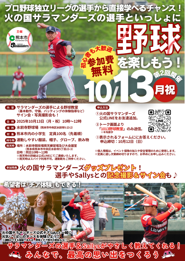 ①火の国サラマンダーズ公式LINEをお友達追加。 【お友達追加】②トーク画面より「1013野球教室」のみ送信。※数字は全て半角 ③表示されるフォームににお答えください。 申込締切:10月12日(日)