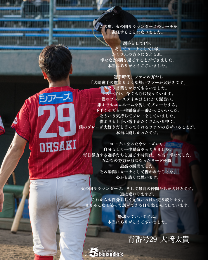 この度、以下の選手が任意引退となりましたのでお知らせいたします。 【任意引退】 外野手 大﨑太貴  (#29) なお、大﨑太貴 野手総合コーチは退任となります。 _____________________________________ 【大﨑太貴 野手総合コーチ兼任選手コメント】