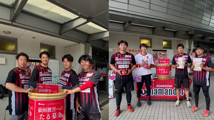 このたびの令和7年8月豪雨により被災された皆さまに、心よりお見舞い申し上げます。 火の国サラマンダーズでは、被災地の一日も早い復旧・復興を願い、2025年8月15日(金)〜17日(日)にかけて開催いたしました3連戦イベント「とかげの夏休み」をチャリティー形式に変更し、義援金の募金活動を実施いたしました。 当日は、球場内に「たる募金」を設置し、多くのご来場者の皆さまから温かいご支援を賜りました。皆さまのご厚意に、心より御礼申し上げます。![]()