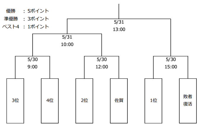 第1試合9時試合開始リーグ戦3位チーム対リーグ戦4位チーム 第2試合12時試合開始 リーグ戦2位チーム対佐賀アジアドリームズ 第3試合15時試合開始 リーグ戦1位チーム対敗者復活チーム(第1・2試合戦チームでリーグ戦順位が上のチーム)
